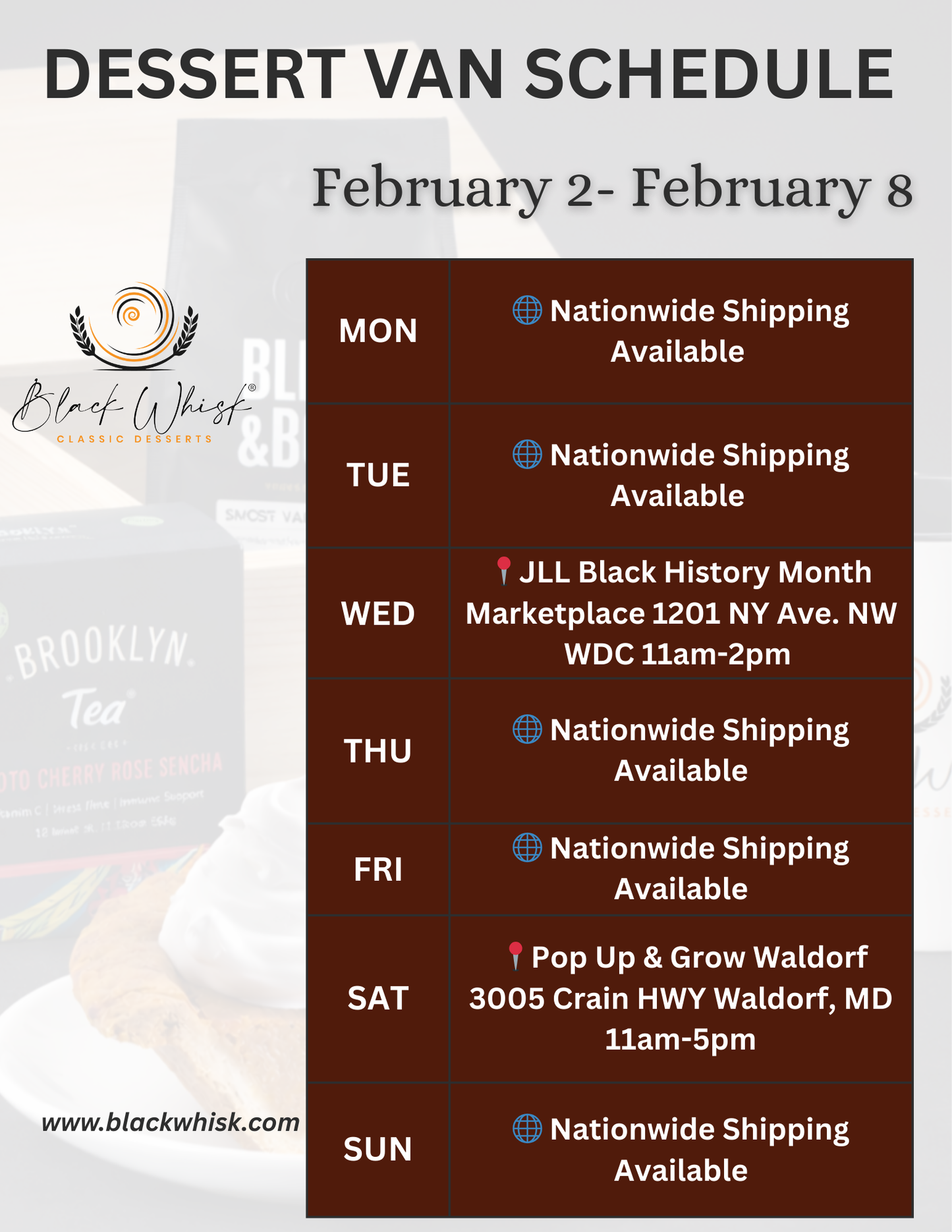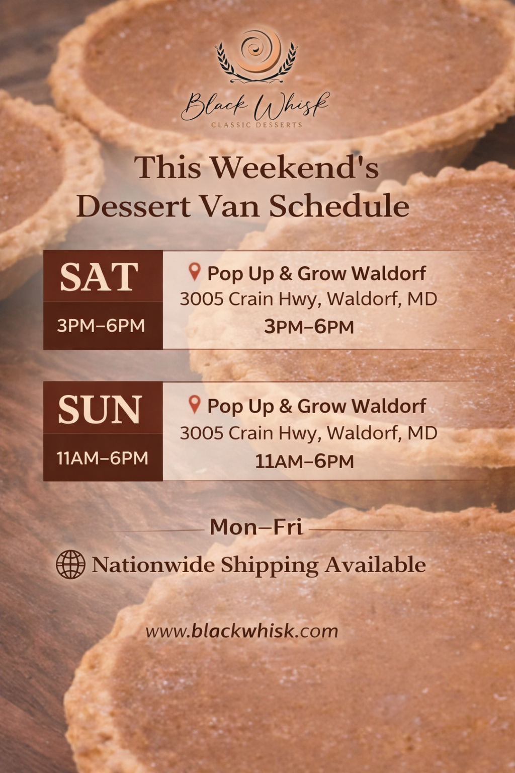 Follow @blackwhiskdesserts for pop-up alerts, weather moves, and surprise drops.