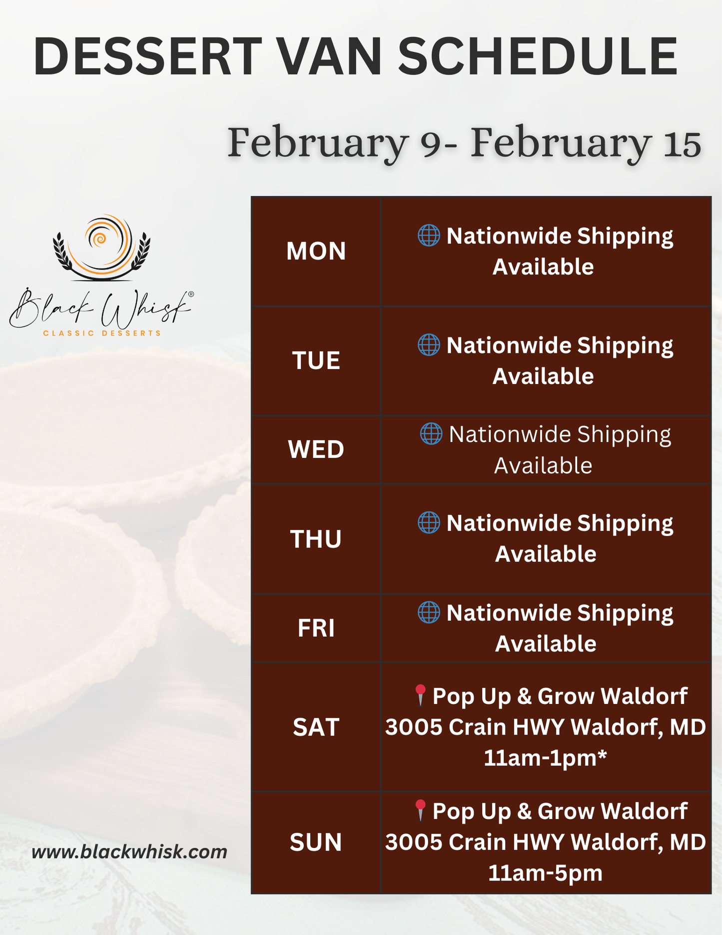Follow @blackwhiskdesserts for pop-up alerts, weather moves, and surprise drops.